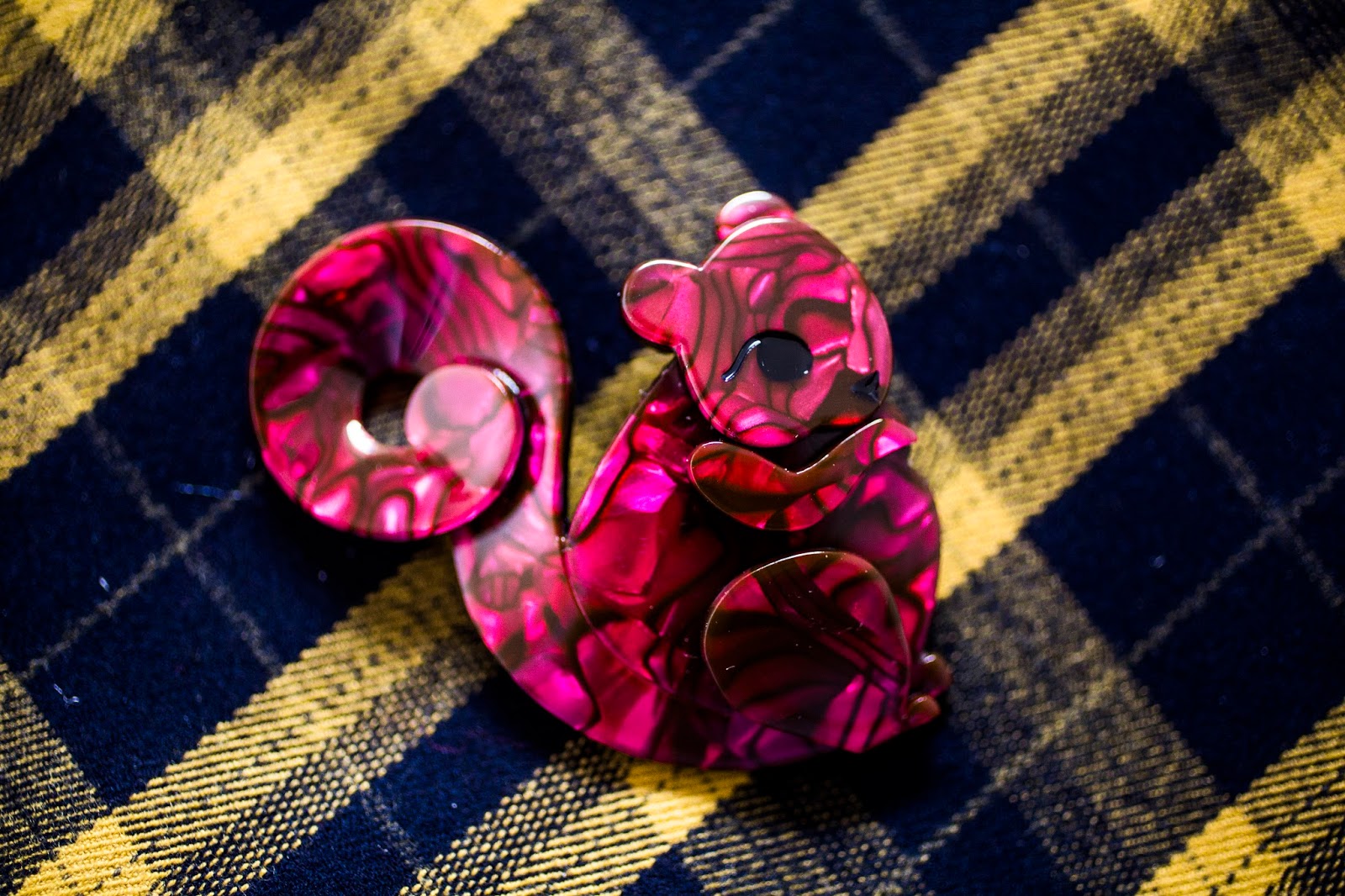 This is also the first time I have seen Erstwilder produce a curved brooch. Saskia the Squirrel is barely flat at all, and the resin both in the body and tail has been moulded into more of a rounded shape. While this threw me off a little at first it really changes the look of the design and makes it look alot less like a traditional Erstwilder piece.