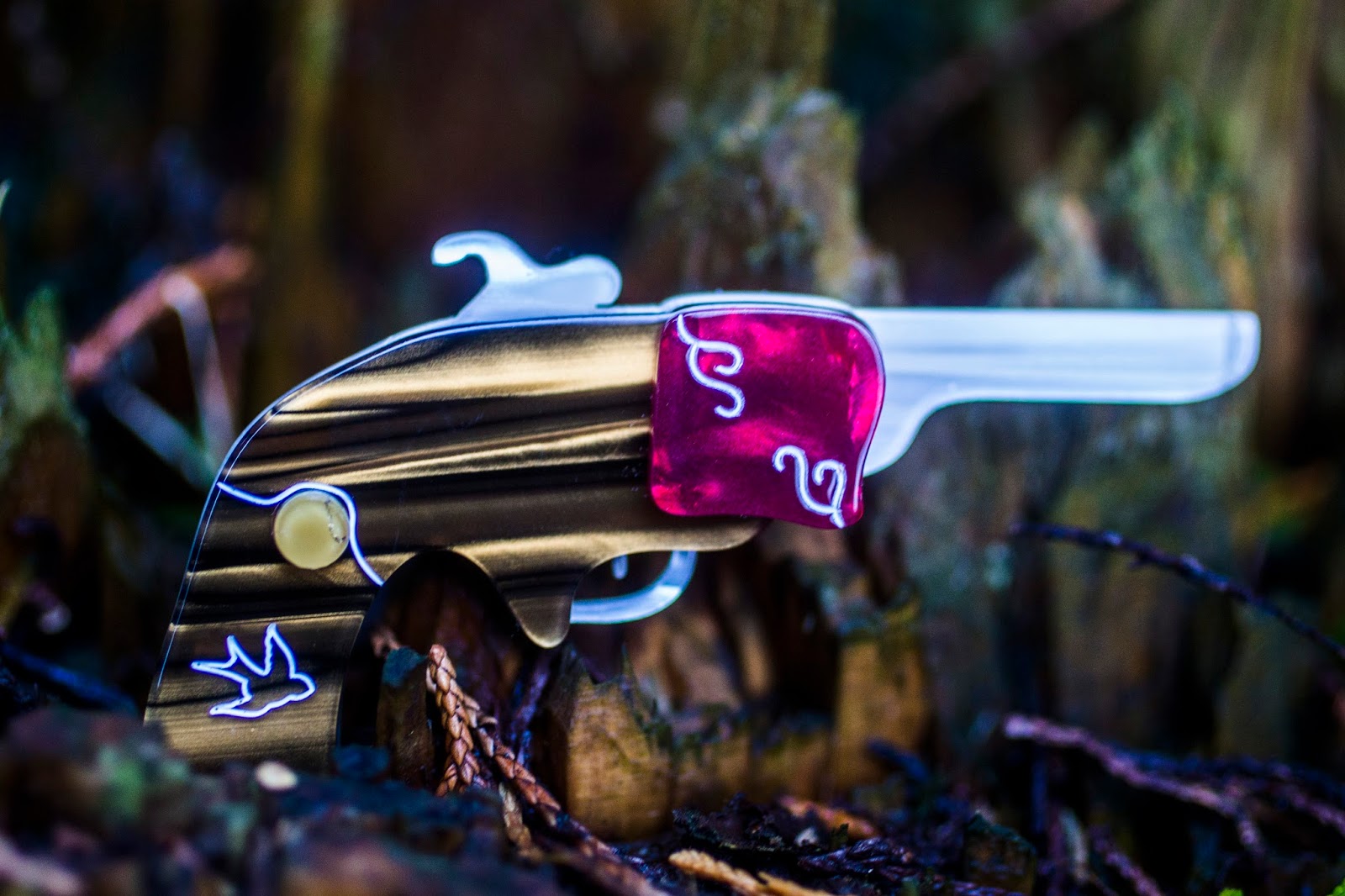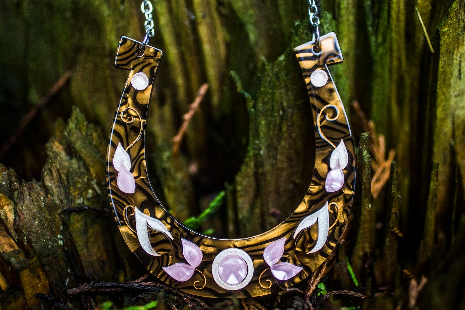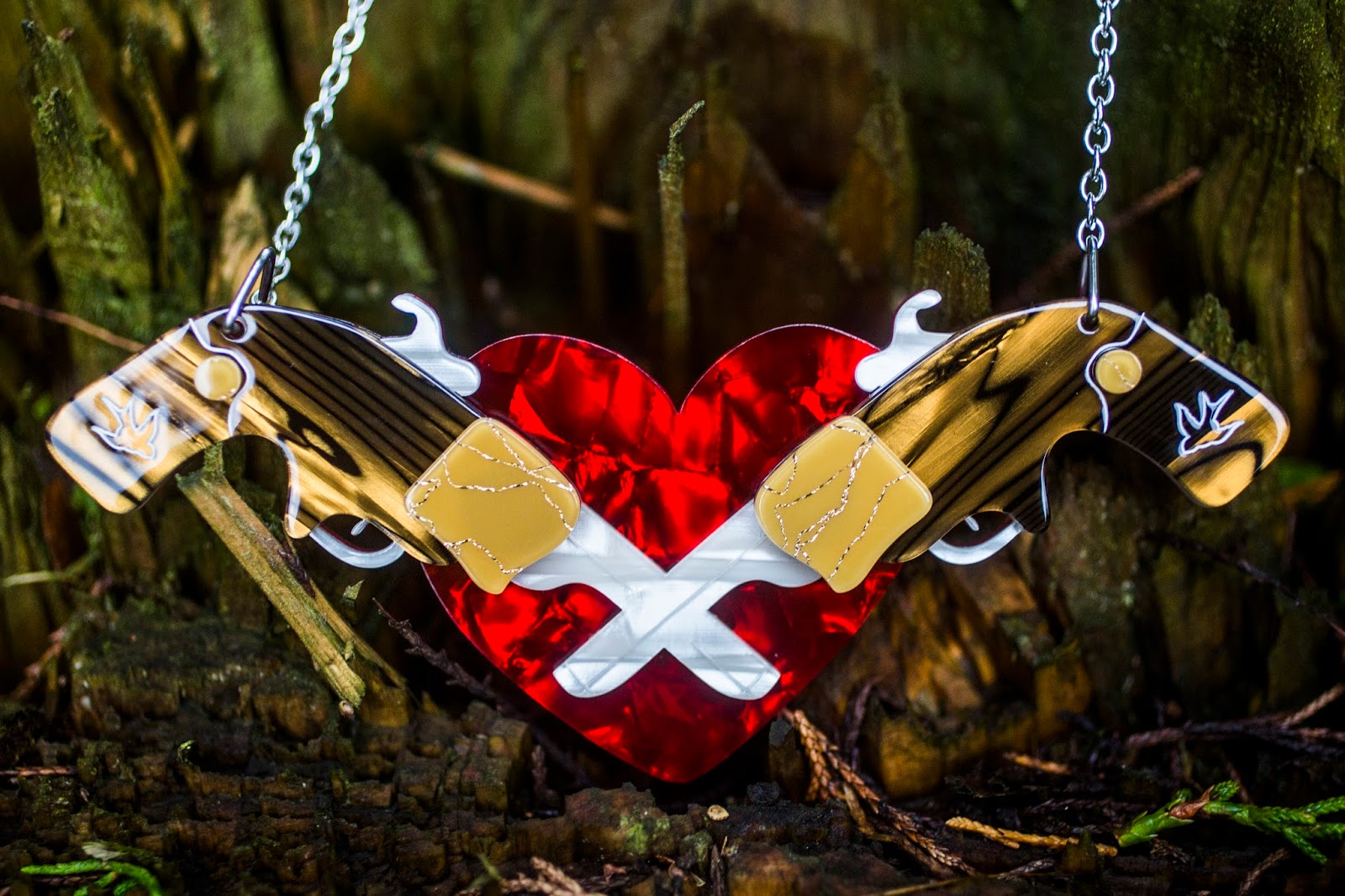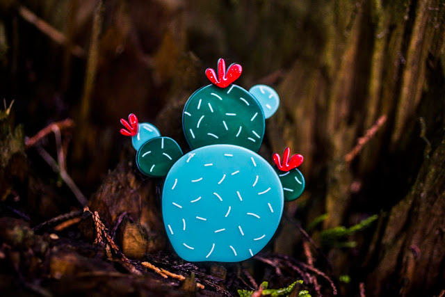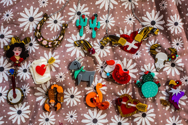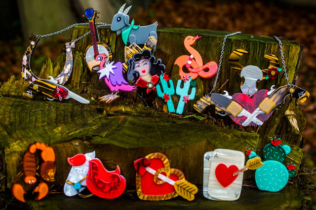For this collection we are treated to twelve brooches, two very different necklaces and one lovely pair of cactus earrings. Each necklace is completely different and are two very different sizes for this collection, the double gun necklace comes in possibly the largest Erstwilder box I've ever seen and is really quite a statement piece, while the other horseshoe necklace is alot more subtle, with smaller details and an overall more delicate design.