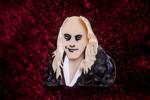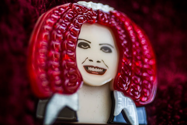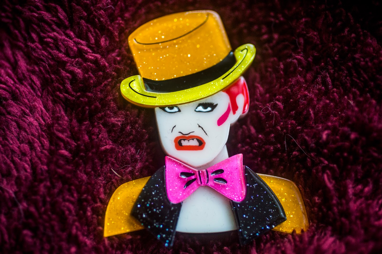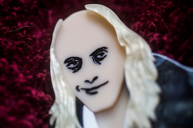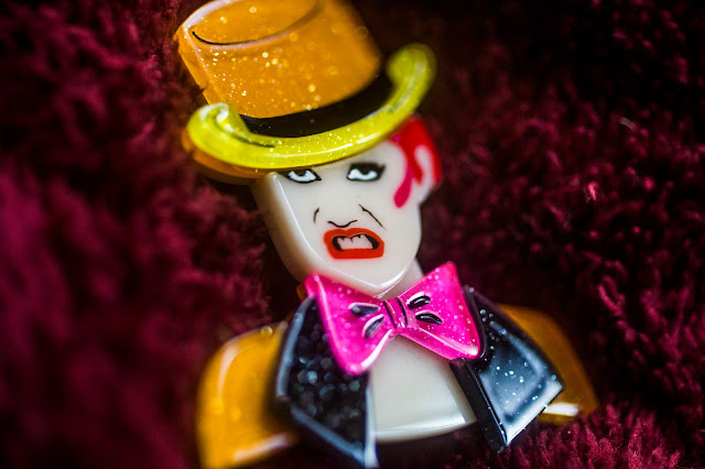 With these you haven't lost the usual cartoon-ish feel that Erstwilder is know for. While the faces might be very realistic the rest of the brooch is covered in crazy patterned acrylic and brings the brooches back into the style that we know and love. I completely admire what they have tried to do with these pieces, create something in keeping but without loosing their brand identity.